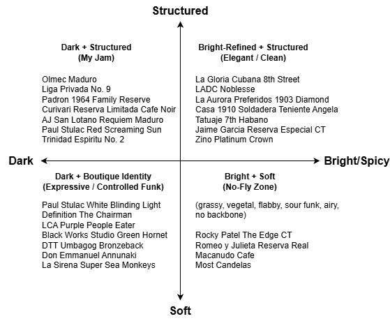 I’m always trying to understand why I like certain things. And one process I learned over forty years ago, when I took a wine appreciation class in college, was to draw out a quadrant graph, then place the different wines I had tasted in the quadrants. It was a great way of exploring new wines while avoiding the noise. So, I decided to apply that to cigars. Here’s my graph below.